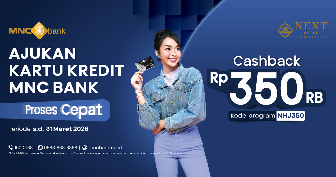 - Wajib melakukan minimum transaksi di Next Hotel Yogyakarta senilai Rp500.000 (lima ratus ribu Rupiah) dalam periode 30 (tiga puluh) hari kalender sejak Kartu Kredit MNC Bank disetujui